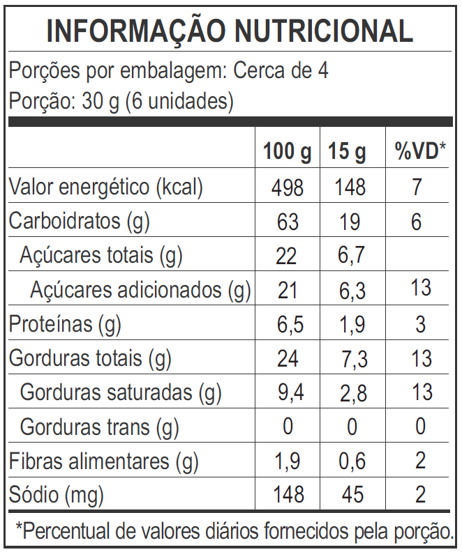 Porções por embalagem: 3 ▪ Porção: 30g (6 unidades)